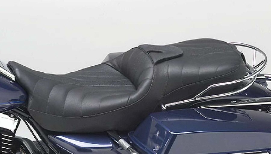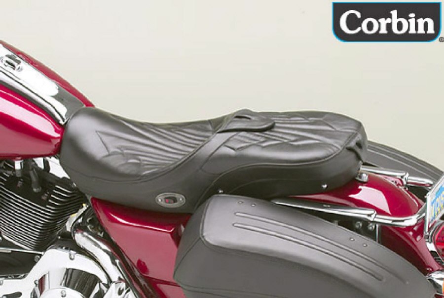 This model is designed specifically to fit the larger fuel tank and dash panels of the 2008 series Roadking. Because of the precise fit offered by the Corbin saddle, this seat is not interchangeable with the other HD Bagger seats (Street Glide, Electra Glide & Road Glide). Looking at the photos above, you'll see this design offers a vast improvement in how the seat meets the tank. This sculpted nose section also offers an easier reach to the pavement.