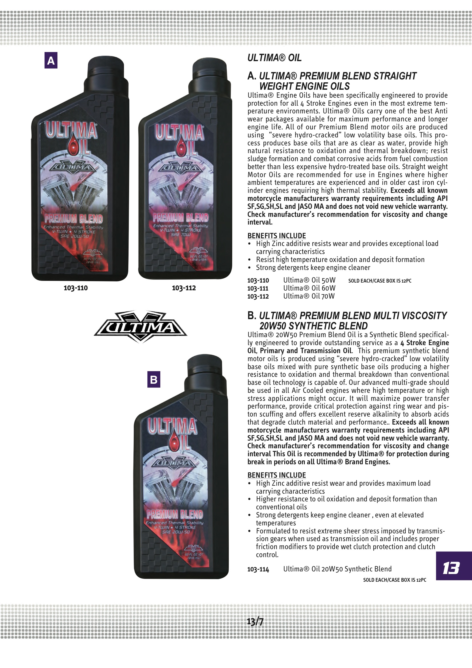 Harley Davidson Spares Midwest Motorcycle Ultima ULTIMA SAE 20W-50;SYNTHETIC BLEND 103-114