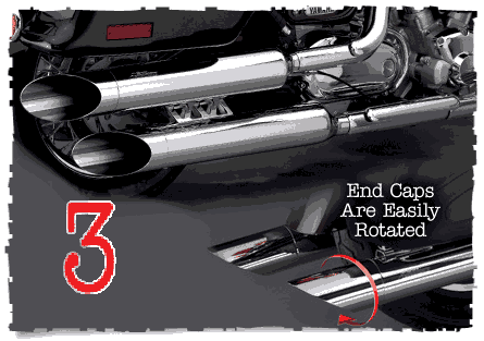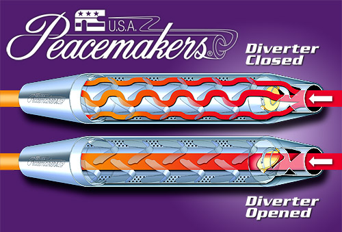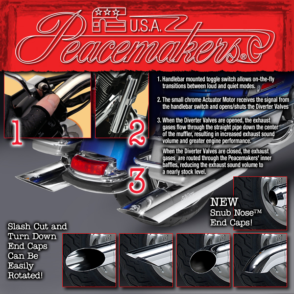 Product Description: The handlebar-mounted toggle switch allows on-the-fly transitions between loud and quiet modes. The small chrome Actuator Motor, mounted to the right front frame tube, receives the signal from the handlebar switch and opens/shuts the Diverter Valves via heavy duty cables. When the Diverter Valves are opened, the exhaust gases flow through the straight pipe down the center of the muffler, resulting in increased exhaust sound volume and greater engine performance. When the Diverter Valves are closed, the exhaust gases are routed through the Peacemakers' inner baffles, reducing the exhaust sound volume to a nearly stock level.