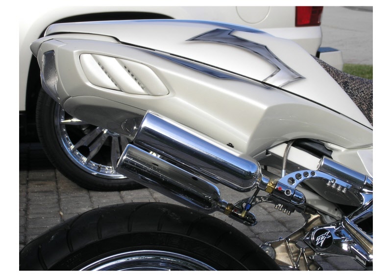 This Magnum Motorcycle Nitrous Kit wet kit will add up to an additional 150HP to your Motorcycle with a professionally tuned motor. Comes as complete installation including single bottle and billet brackets. that mounts to the frame tubes . This wet kit uses a small fuel pump and will mix nitrous and fuel right at the carburettor outlet. Comes with two jet settings of 18HP & 34HP others are available from Custom Cruisers call 01773835666